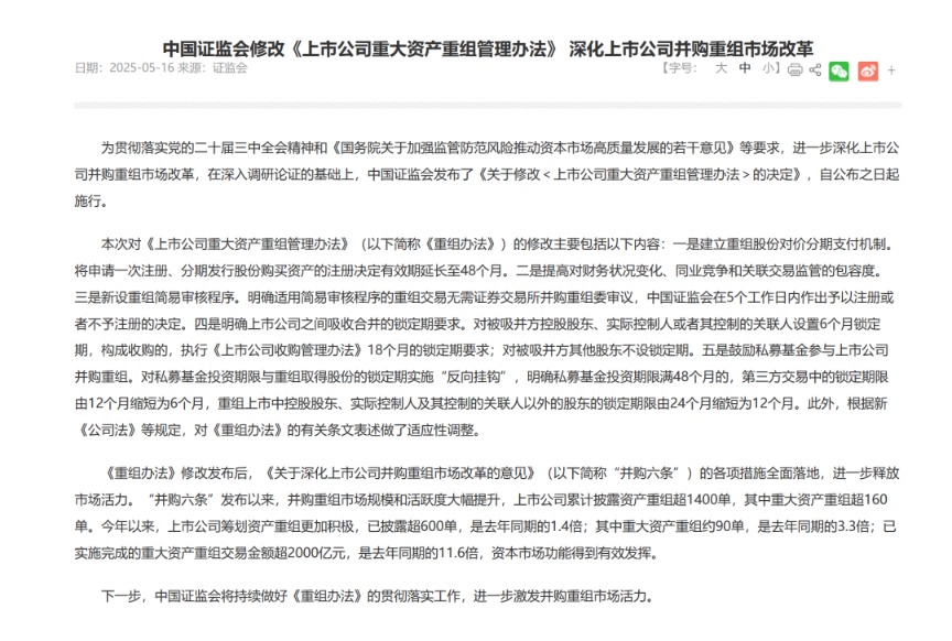 5月16日,中国证监会正式对外公布实施修订后的《上市公司重大资产重组管理办法》,在简化审核程序、创新交易工具、提升监管包容度等方面作出优化。