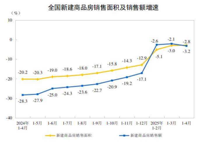 1—4月份,新建商品房销售面积28262万平方米,同比下降2.8%,降幅比1—3月份收窄0.2个百分点;其中住宅销售面积下降2.1%。新建商品房销售额27035亿元,下降3.2%;其中住宅销售额下降1.9%。