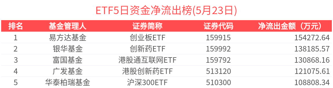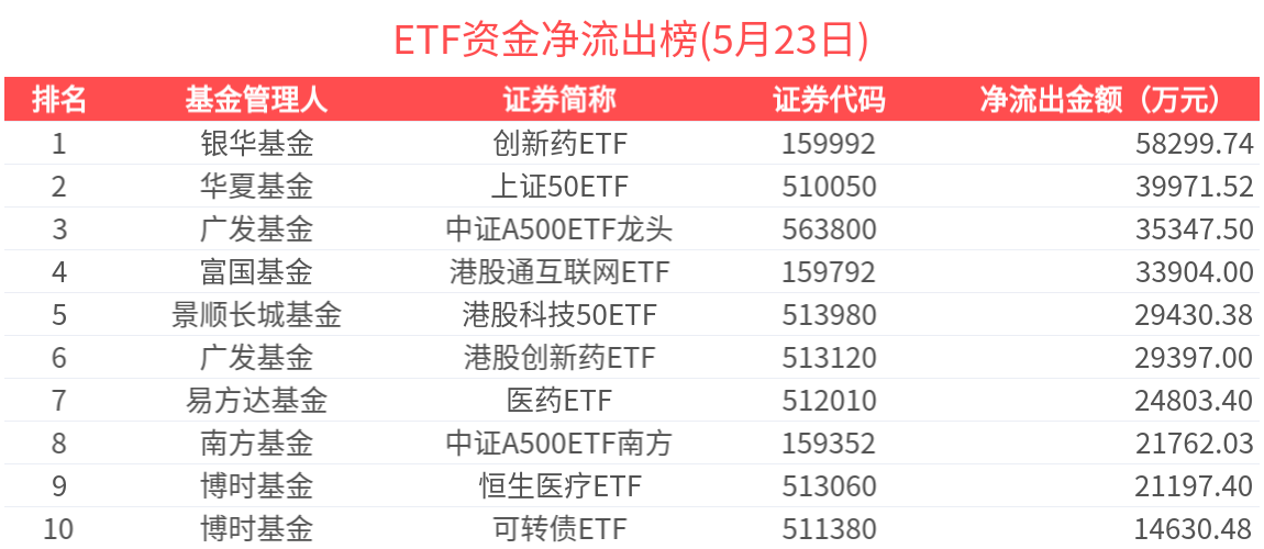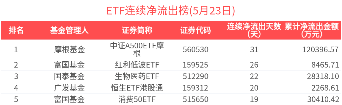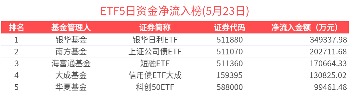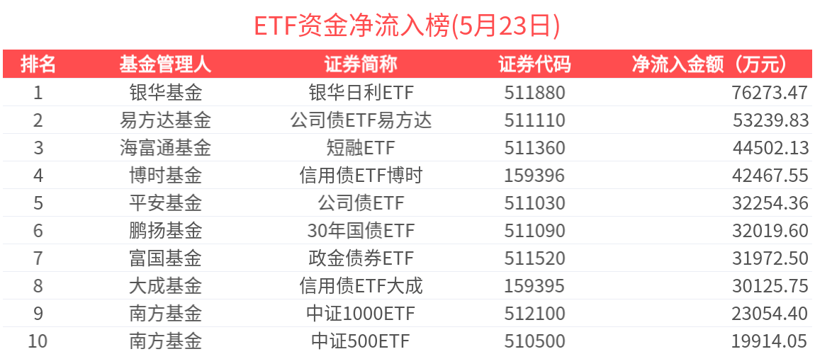 2025年5月23日共259只ETF基金获资金净流入,353只ETF基金净流出。净流入金额超1亿元的有21只,银华日利ETF(511880.SH)、公司债ETF易方达(511110.SH)、短融ETF(511360.SH)、信用债ETF博时(159396.SZ)、公司债ETF(511030.SH)资金显著流入,分别净流入7.63亿元、5.32亿元、4.45亿元、4.25亿元、3.23亿元(净申购份额*单位净值)。