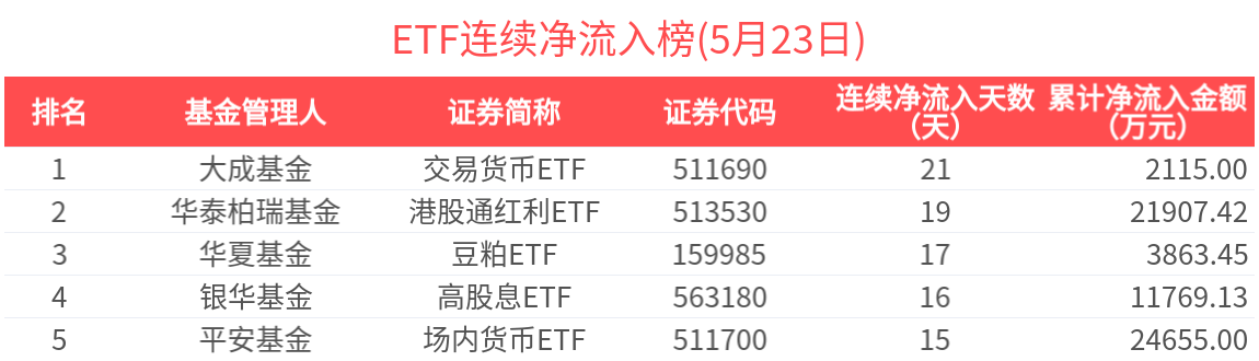 近期连续净流入的ETF基金有142只,居前的为交易货币ETF(21天)、港股通红利ETF(19天)、豆粕ETF(17天)、高股息ETF(16天)、场内货币ETF(15天),分别净流入2115.00万元、2.19亿元、3863.45万元、1.18亿元、2.47亿元。其中,港股通红利ETF近19天加速流入,近19天累计流入2.19亿元,基金规模快速增长至18.42亿元。