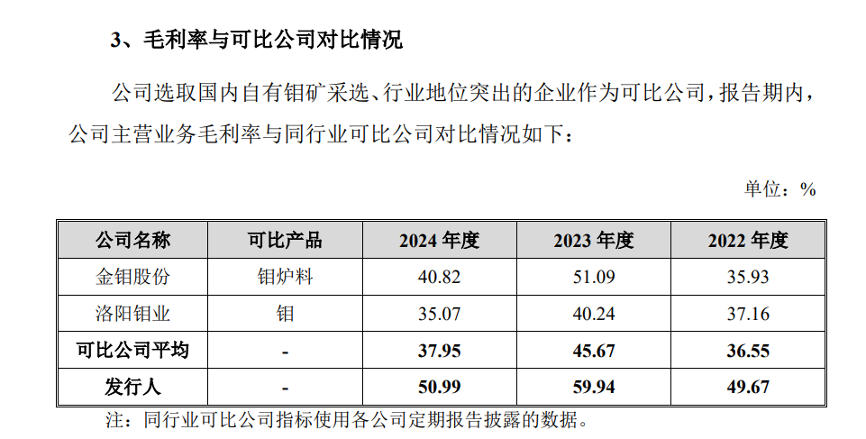 对此,盛龙股份解释称,毛利率较金钼股份高,主要系相较公司将钼精矿作为主要产品,金钼股份存在采购钼精矿进一步加工成焙烧钼精矿、钼铁的情形,加工环节整体毛利率较低。公司毛利率较洛阳钼业高,一方面系洛阳钼业钼铁销量占比较高,另一方面系矿山整体开采阶段不同,公司矿山已开采年限较短,开采深度较浅,综合开采成本低,毛利率较高。