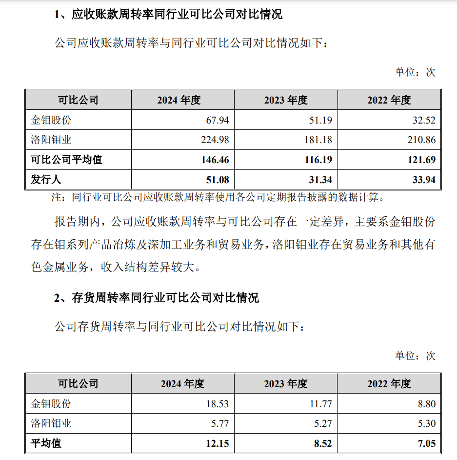 目前,钼金属和钼精矿均处于高位,盛龙股份囤积如此之多的钼精矿令人感到疑惑。金钼股份是A股钼精矿及钼金属加工的龙头,2022-2024年,公司营收分别为95.31亿元、115.31亿元和135.71亿元,归母净利润分别为13.35亿元、30.99亿元和29.93亿元,规模要远大于盛龙股份,但其期末的存货余额分别为5.04亿元、4.24亿元和3.96亿元,存货不但低于盛龙股份,而且在走低。存货较高将使得资金回收速度变慢,盛龙股份将面临流动资金偏紧的风险。