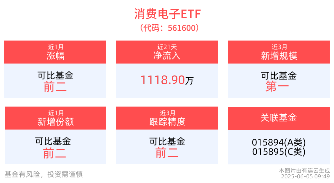 规模方面,消费电子ETF近3月规模增长415.00万元,实现显著增长,新增规模位居可比基金1/5。