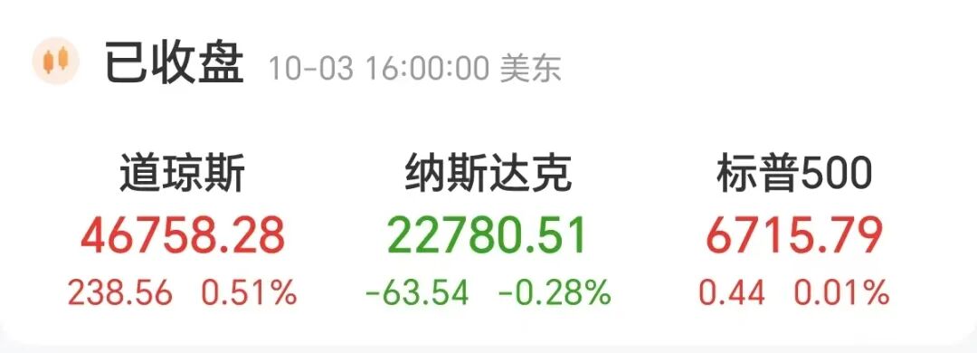 美股三大指数当地时间周五(10月3日)收盘涨跌不一。道指、标普录得日线六连涨,续创历史新高。截至收盘,道琼斯工业平均指数比前一交易日上涨238.56点,收于46758.28点,涨幅为0.51%;标准普尔500种股票指数上涨0.44点,收于6715.79点,涨幅为0.01%;纳斯达克综合指数下跌63.54点,收于22780.51点,跌幅为0.28%。本周,道指累涨1.1%,纳指累涨1.32%,标普累涨1.09%。