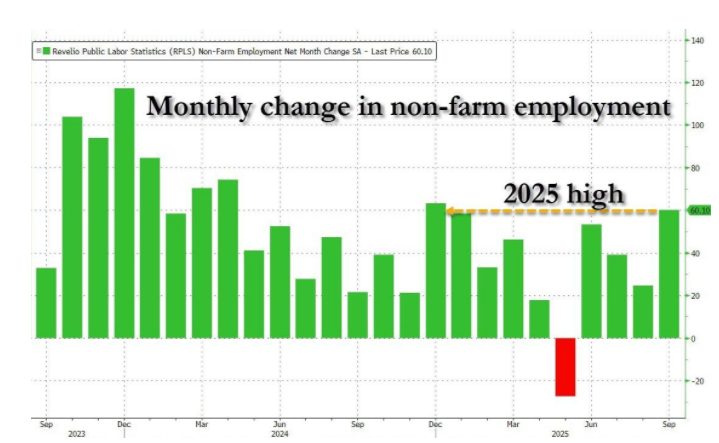 私人数据提供商Revelio Labs报告(RPLS)显示,9月份美国新增就业岗位6万个,为2025年最佳。这一数据远超此前ADP报告的负3.2万个岗位流失,有效缓解了市场对劳动力衰退的担忧。