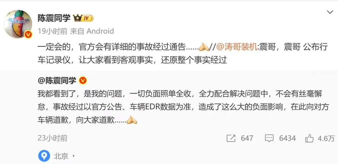 警方发布通报后,陈震发文致歉:我都看到了,是我的问题,一切负面照单全收,全力配合解决问题中,不会有丝毫懈怠,事故经过以官方公告、车辆EDR数据为准,造成了这么大的负面影响,在此向对方车辆道歉,向大家道歉。