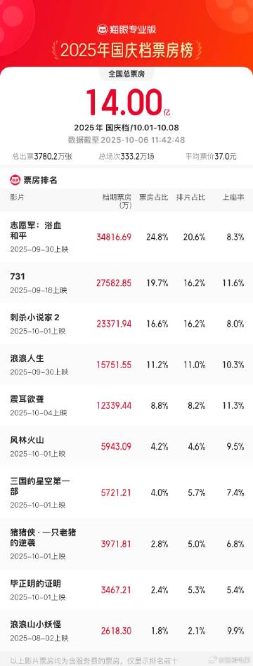 据猫眼专业版数据,截至10月6日11时42分,2025年国庆档档期票房破14亿,《志愿军:浴血和平》《731》《刺杀小说家2》分列前三位。