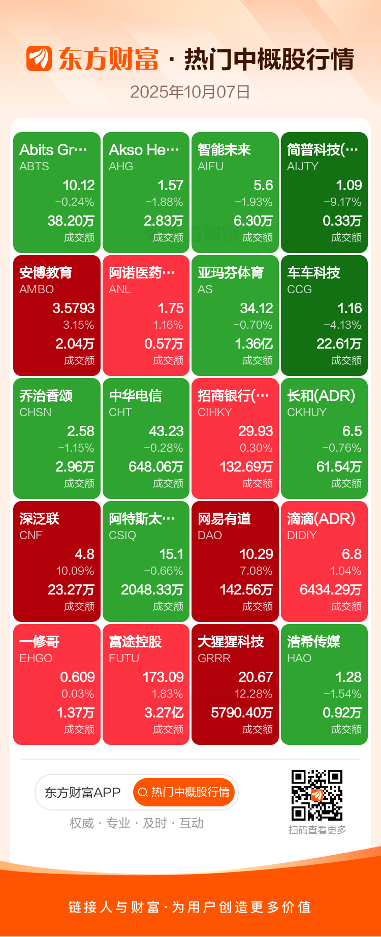 Abits Group Inc跌0.24%,Akso Health Group ADR跌1.88%,智能未来跌1.93%,简普科技(ADR)跌9.17%,安博教育涨3.15%,阿诺医药集团涨1.16%,亚玛芬体育跌0.70%,车车科技跌4.13%,乔治香颂跌1.15%,中华电信跌0.28%。