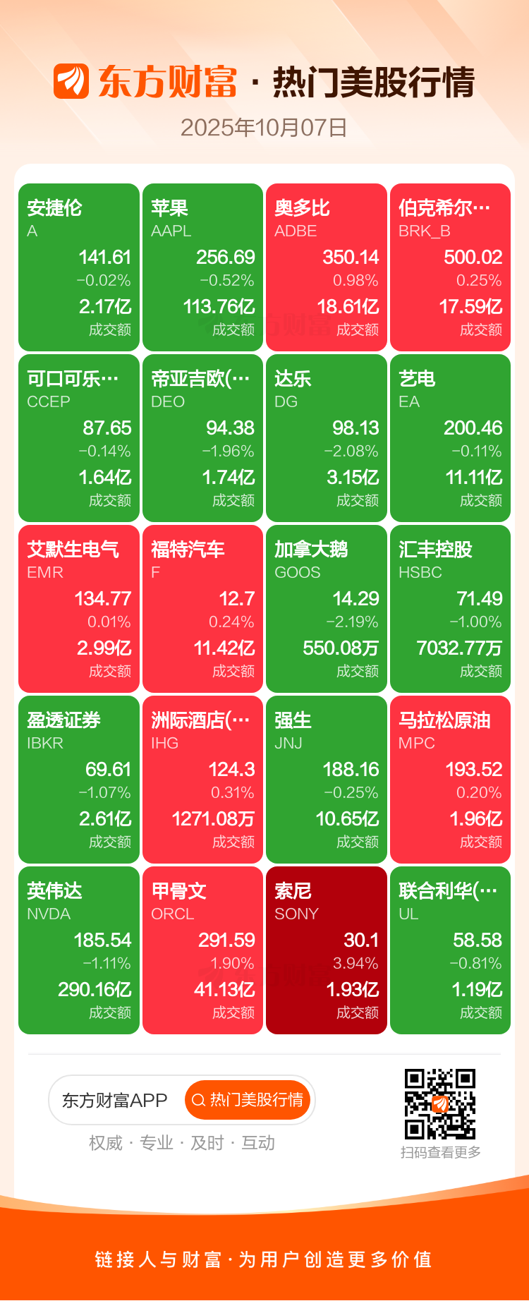安捷伦跌0.02%,苹果跌0.52%,奥多比涨0.98%,伯克希尔哈撒韦-B涨0.25%,可口可乐欧洲太平洋合伙(US)跌0.14%,帝亚吉欧(US ADR)跌1.96%,达乐跌2.08%,艺电跌0.11%,艾默生电气涨0.01%,福特汽车涨0.24%。
