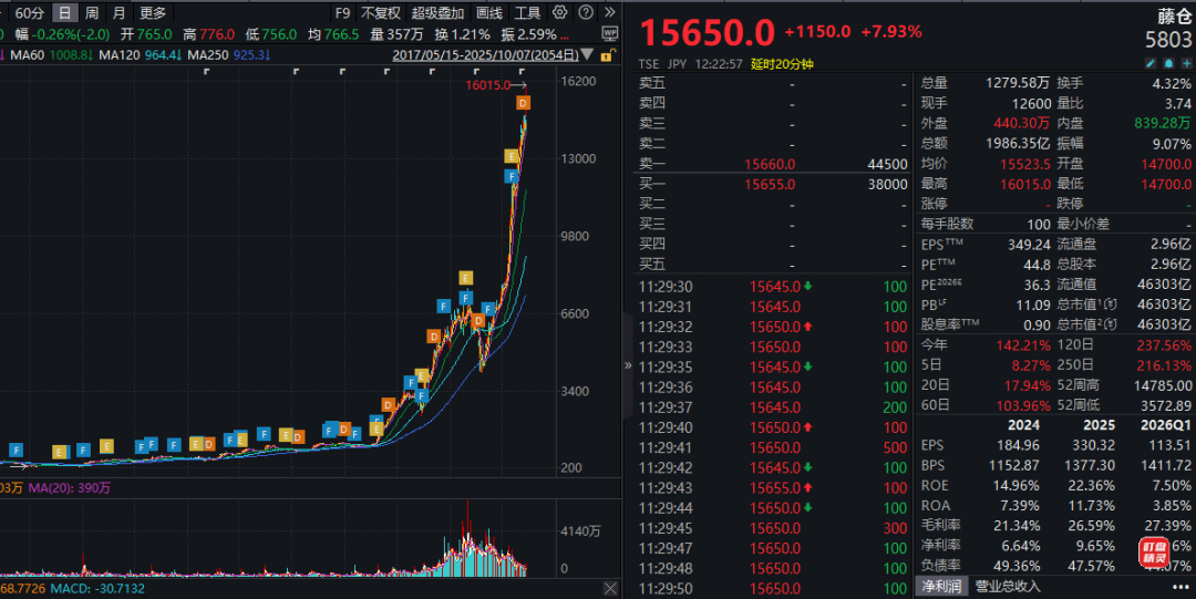 行情数据显示,藤仓为近年来日本股市最牛的股票之一,2025年以来股价涨幅已超过100%。而在过去的2024年,藤仓股价涨幅超过500%。这意味着,在最近两年时间里,公司股价自低位的最大涨幅已经超过10倍。对于藤仓近年股价暴涨的原因,有市场观点认为受益于AI带来的电力需求增加,以及其他一些方面需求的增加。