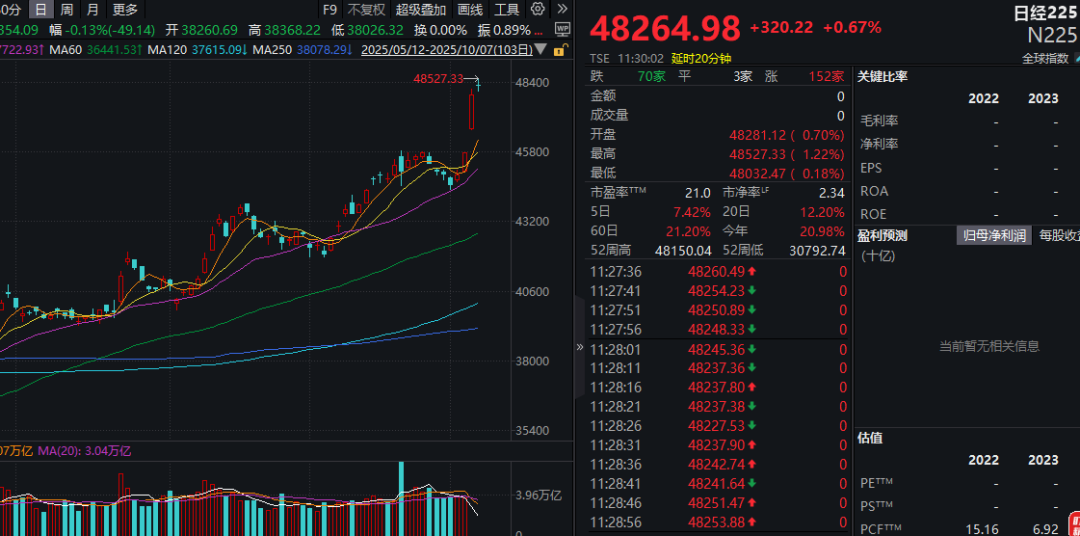 10月7日,日本股市整体进一步上行,其中日本日经225指数上午收盘上涨0.67%,至48264.98点,盘中一度再创历史新高。日本东证指数上午收盘上涨0.28%,至3235.13点。