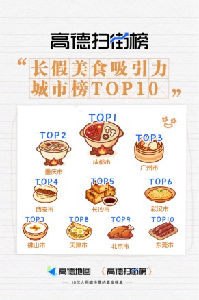 这个长假,美食成为许多人的出行动力。在高德扫街榜最新发布的“长假美食吸引力城市榜TOP10”中,“川渝湘”的热辣滚烫与“广佛莞”的清鲜本味分庭抗礼,其中成都力压重庆摘得桂冠。“美食飙升榜”上,重庆榜单里有七家是火锅店,无愧于“火锅之都”的称号。