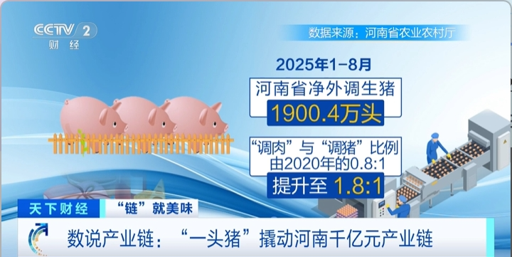 今年1-8月河南省净外调生猪1900.4万头,“调肉”与“调猪”比例由2020年的0.8:1提升至1.8:1,为全国“肉篮子”夯实了基础。