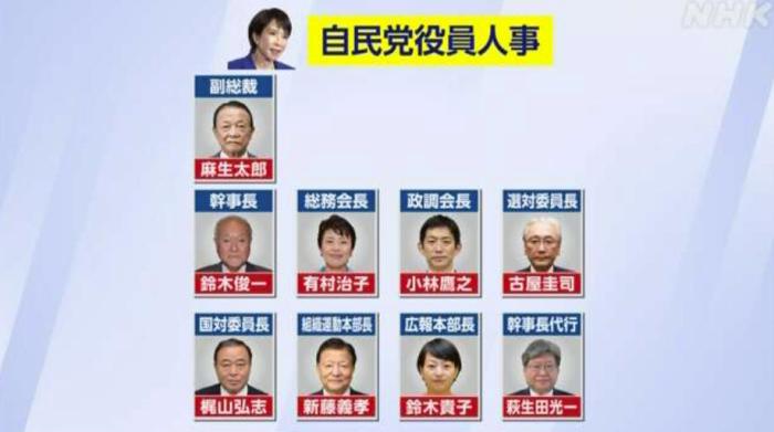 根据任命,麻生太郎担任自民党副总裁。此外,自民党“四大要职”中,铃木俊一出任干事长、有村治子出任总务会长、小林鹰之出任政调会长,古屋圭司则担任选举对策委员长。