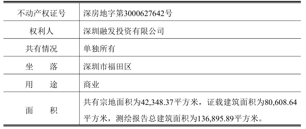 司法评估报告显示,皇庭广场宗地面积为42348.37平方米,证载建筑面积为80608.64平方米(其中地上商业14377.3平方米、半地下商业46417.76平方米、地下商业19813.58平方米),测绘报告总建筑面积为136895.89平方米,土地使用年限为40年(从2002年10月8日至2042年10月7日)。