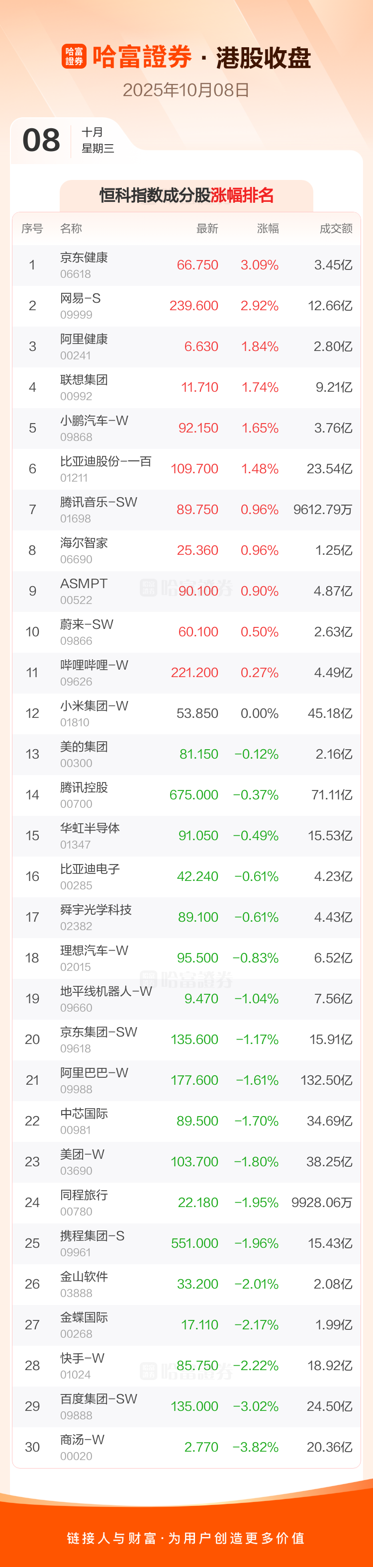 港股10月8日收盘走低 ,恒生指数收报26829.46点,跌128.31点,跌幅0.48%;恒生科技指数收报6514.19点,跌36.11点,跌幅0.55%。恒生指数成分股中恒安国际、吉利汽车、京东健康涨幅居前龙湖集团、百度集团-SW、中国海外发展跌幅靠前恒生科技指数成分股中京东健康、网易-S、阿里健康涨幅居前商汤-W、百度集团-SW、快手-W跌幅靠前