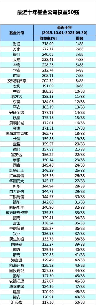 国泰海通证券数据显示,2015年10月1日至2025年9月30日期间,财通基金成为最近十年权益类基金绝对收益榜榜首,最近十年权益基金平均收益率为318.00%,在88家基金中排名第一。