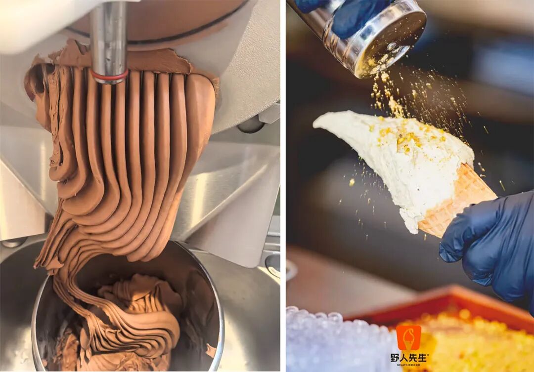 产品造型也是我们首创的——天然纹路、拉丝带尖、昂扬挺拔,每个冰淇淋都是独一无二的创作,让一线伙伴更有成就感。野人先生每年会举办匠心杯大赛,一等奖,奖励意大利旅游。