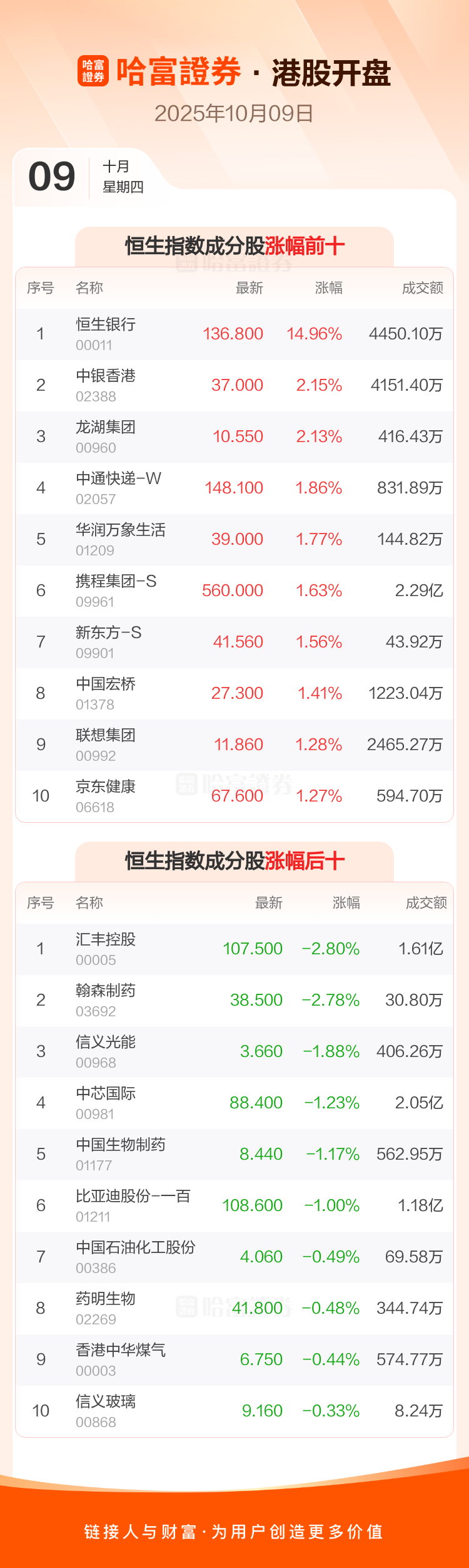 港股开盘:恒指高开0.12% 恒生银行领涨成分股