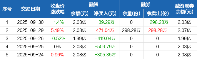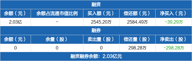 融资方面,当日融资买入2545.2万元,融资偿还2584.49万元,融资净偿还39.29万元。融券方面,融券卖出0份,融券偿还298.28万份,融券余量0份,融券余额0元。融资融券余额合计2.03亿元。