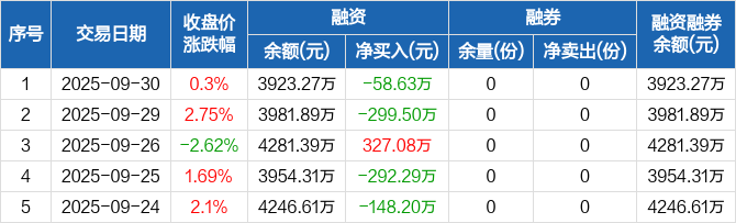 融资方面,当日融资买入257.06万元,融资偿还315.69万元,融资净偿还58.63万元。融券方面,融券卖出0份,融券偿还0份,融券余量0份,融券余额0元。融资融券余额合计3923.27万元。