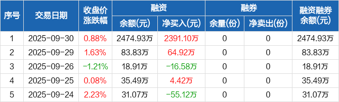 融资方面,当日融资买入2728.12万元,融资偿还337.02万元,融资净买入2391.1万元,净买入额创历史新高。融券方面,融券卖出0份,融券偿还0份,融券余量0份,融券余额0元。融资融券余额合计2474.93万元。