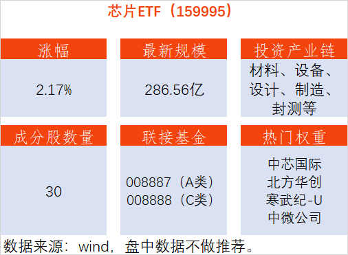 资料显示,芯片ETF(159995)跟踪国证芯片指数,30只成分股集合A股芯片产业中材料、设备、设计、制造、封装和测试等龙头企业,其中包括中芯国际、寒武纪、长电科技、北方华创等。