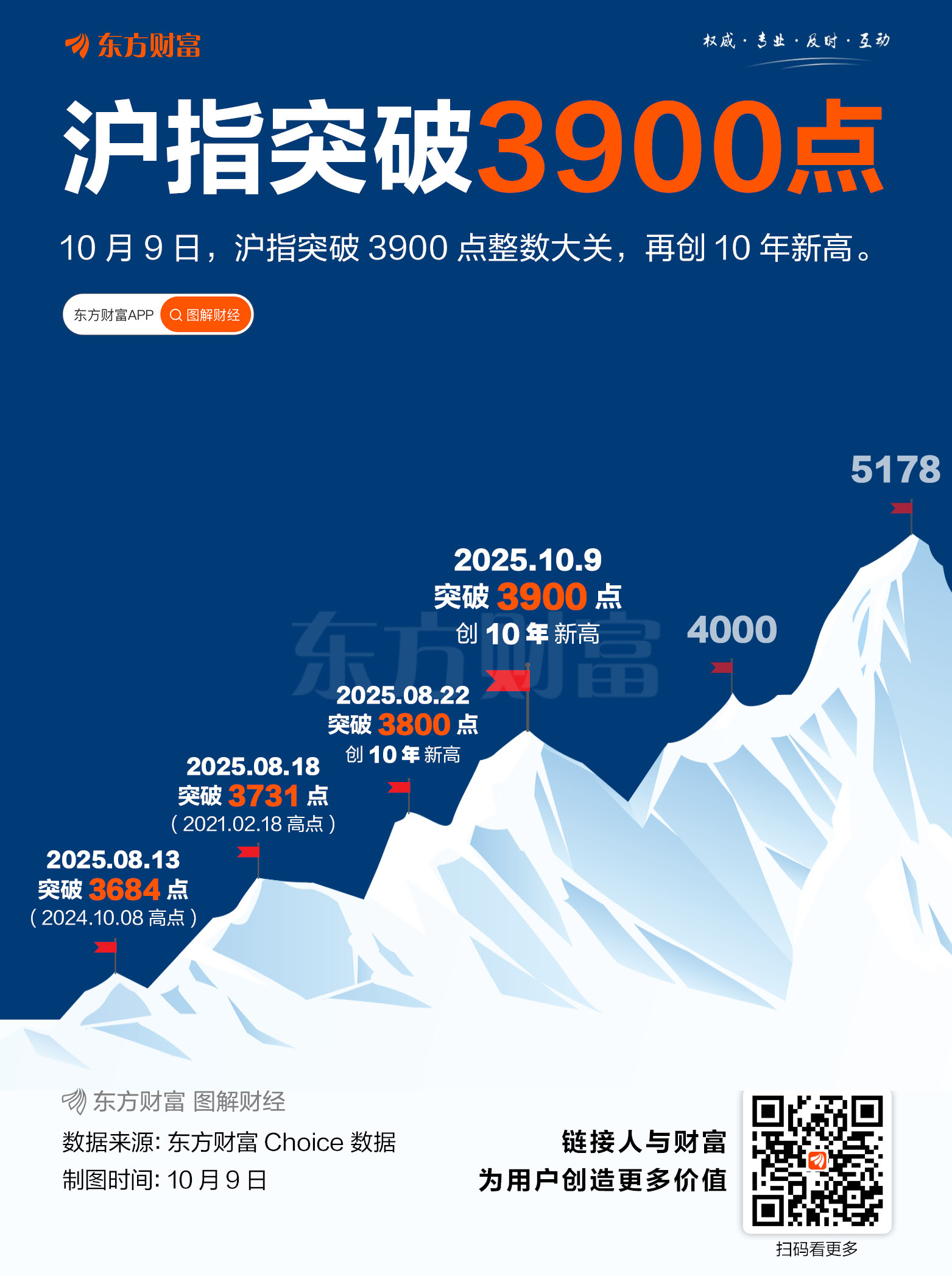 “十一”长假后的首个交易日,A股迎来了里程碑时刻。10月9日,A股三大指数高开高走,沪指突破3900点整数大关,刷新2015年8月以来新高。