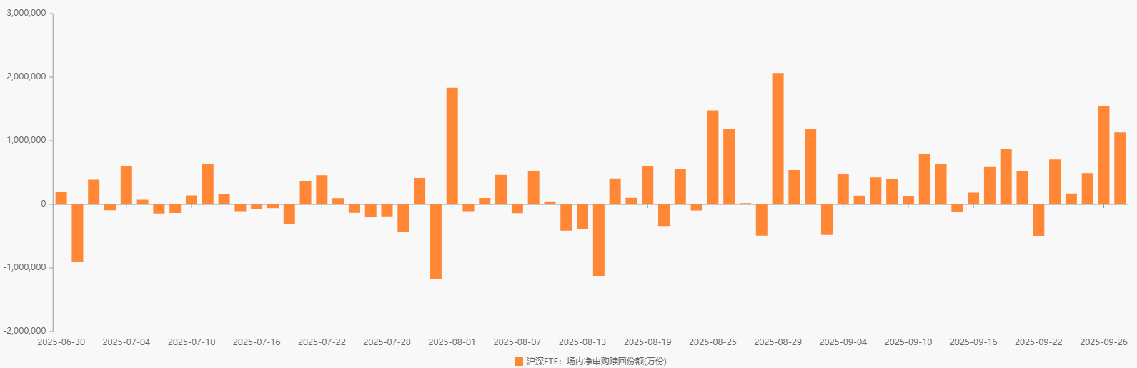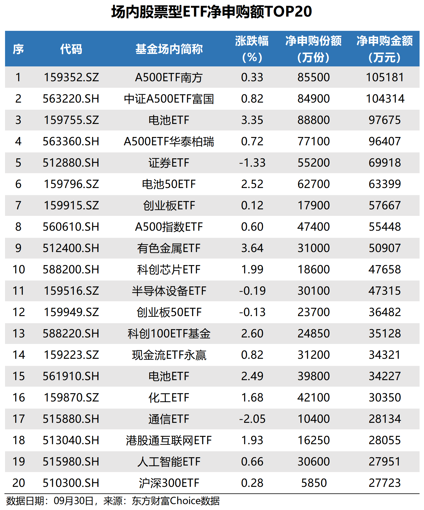 “十一”长假前的最后一个交易日(9月30日),东方财富Choice数据显示,场内股票型ETF净申购87.98亿份;其中,沪市股票型ETF净申购34.00亿份,深市股票型ETF净申购53.98亿份。以最新净值计,9月30日市场净申购117.76亿元。
