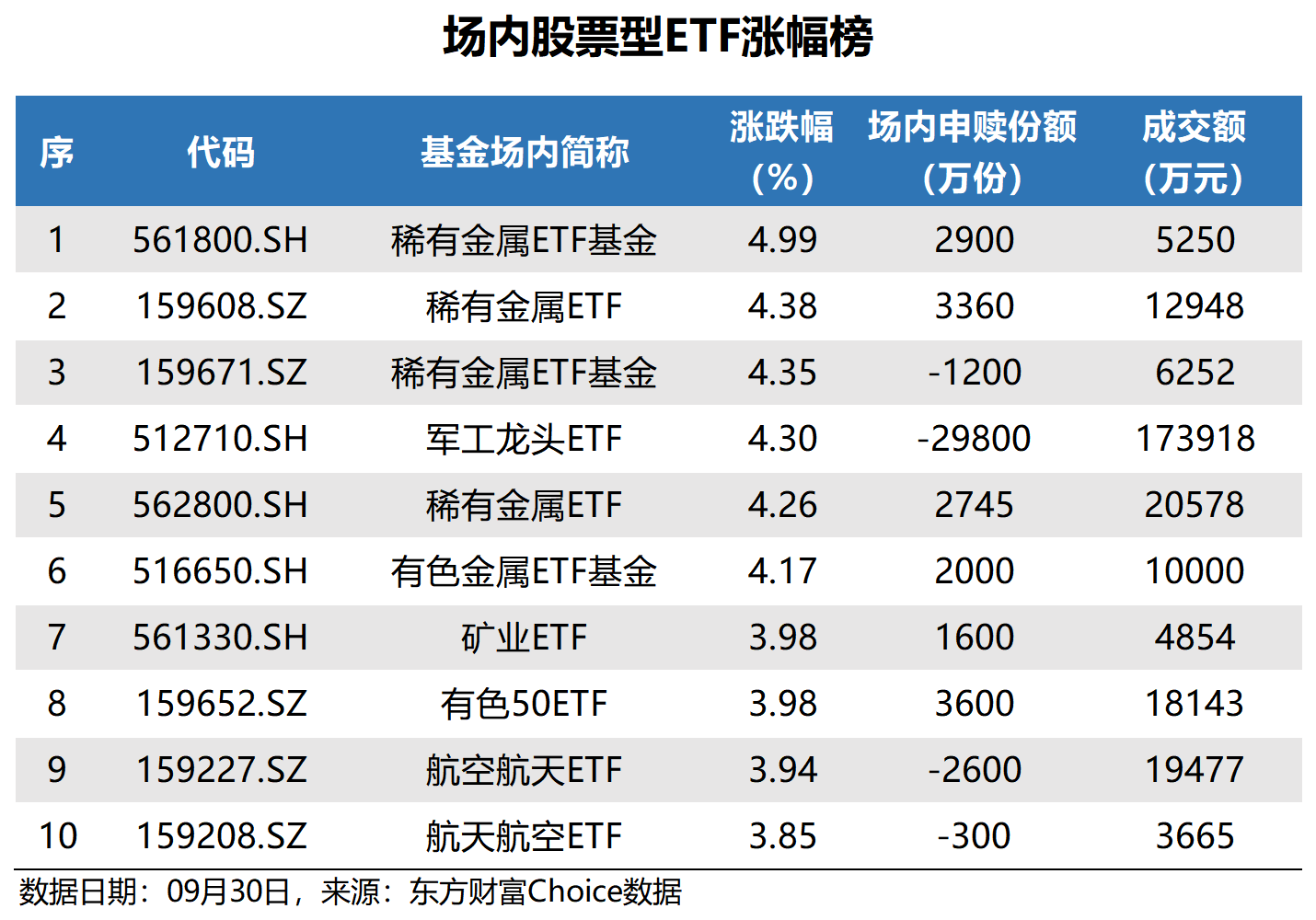 数据显示,昨日场内股票型ETF中,稀有金属ETF基金(561800.SH)、稀有金属ETF、稀有金属ETF基金(159671.SZ)涨幅居前。其中,稀有金属ETF基金(561800.SH)涨幅最大,为4.99%。