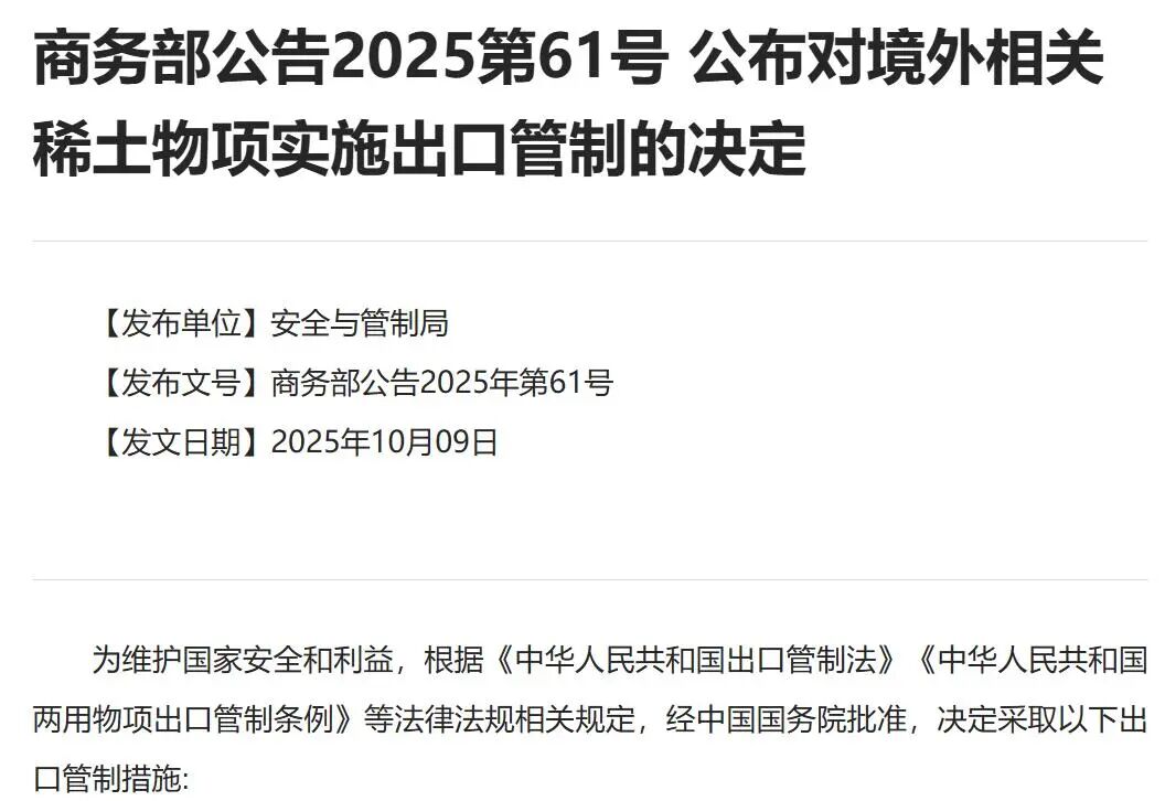 10月9日,商务部公告:为维护国家安全和利益,根据《中华人民共和国出口管制法》《中华人民共和国两用物项出口管制条例》等法律法规相关规定,经国务院批准,决定对稀土相关技术等物项实施出口管制,以下物项未经许可不得出口: