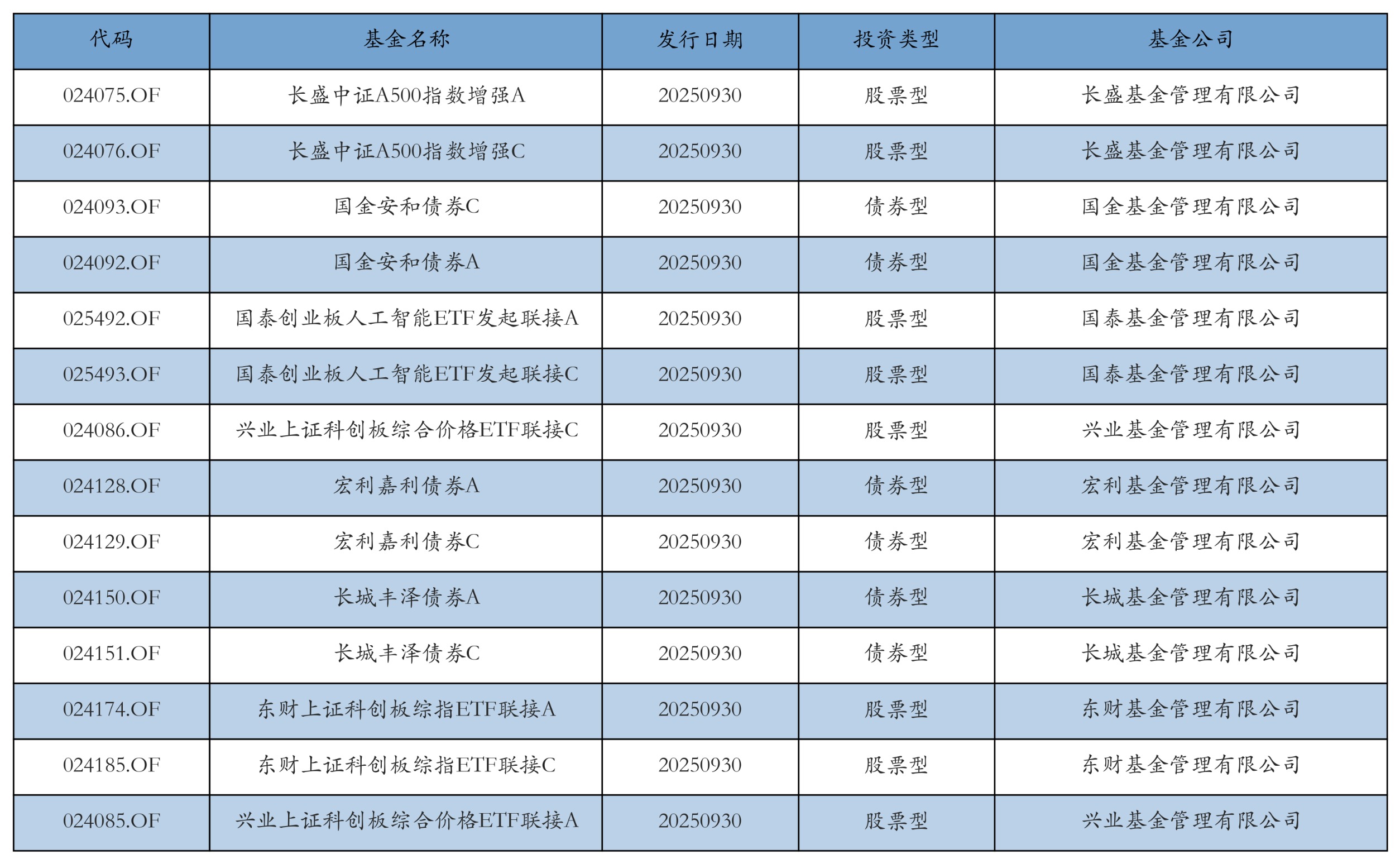 9月30日有14只新基金发行,分别为:长盛中证A500指数增强A、长盛中证A500指数增强C、国金安和债券C、国金安和债券A、国泰创业板人工智能ETF发起联接A、国泰创业板人工智能ETF发起联接C、兴业上证科创板综合价格ETF联接C、宏利嘉利债券A、宏利嘉利债券C、长城丰泽债券A、长城丰泽债券C、东财上证科创板综指ETF联接A、东财上证科创板综指ETF联接C、兴业上证科创板综合价格ETF联接A,详情见下表: