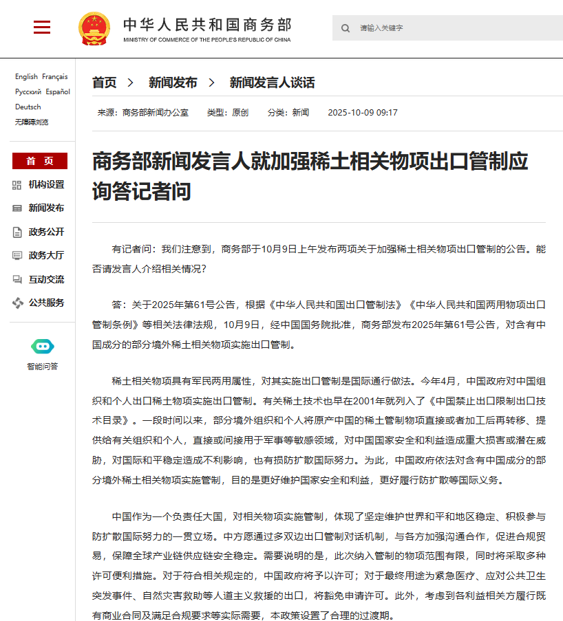关于2025年第62号公告,根据《中华人民共和国出口管制法》《中华人民共和国两用物项出口管制条例》等相关法律法规,10月9日,经中国国务院批准,商务部发布2025年第62号公告,对稀土相关技术实施出口管制。