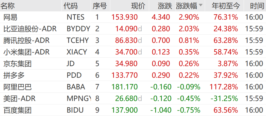 网易涨2.90%,比亚迪股份涨2.03%,腾讯控股涨0.81,领涨万得中概科技龙头指数成份股。
