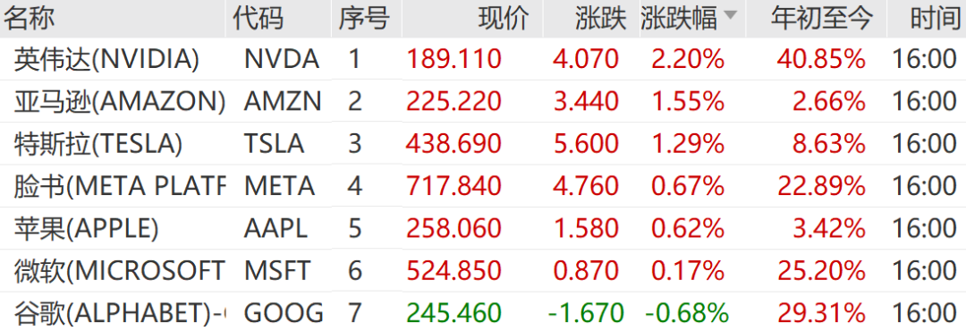 大型科技股多数上涨,万得美国科技七巨头指数上涨0.84%。英伟达涨2.20%,亚马逊涨1.55%,特斯拉涨1.29%,领涨美国科技七巨头。