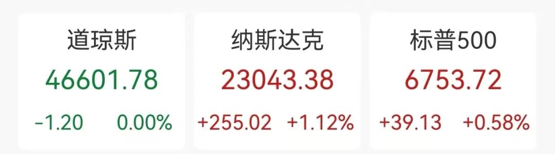 美国三大股指多数收涨,道指持平,报46601.78点;标普500指数涨0.58%,报6753.72点;纳指涨1.12%,报23043.38点。其中,标普500指数、纳指创收盘新高。