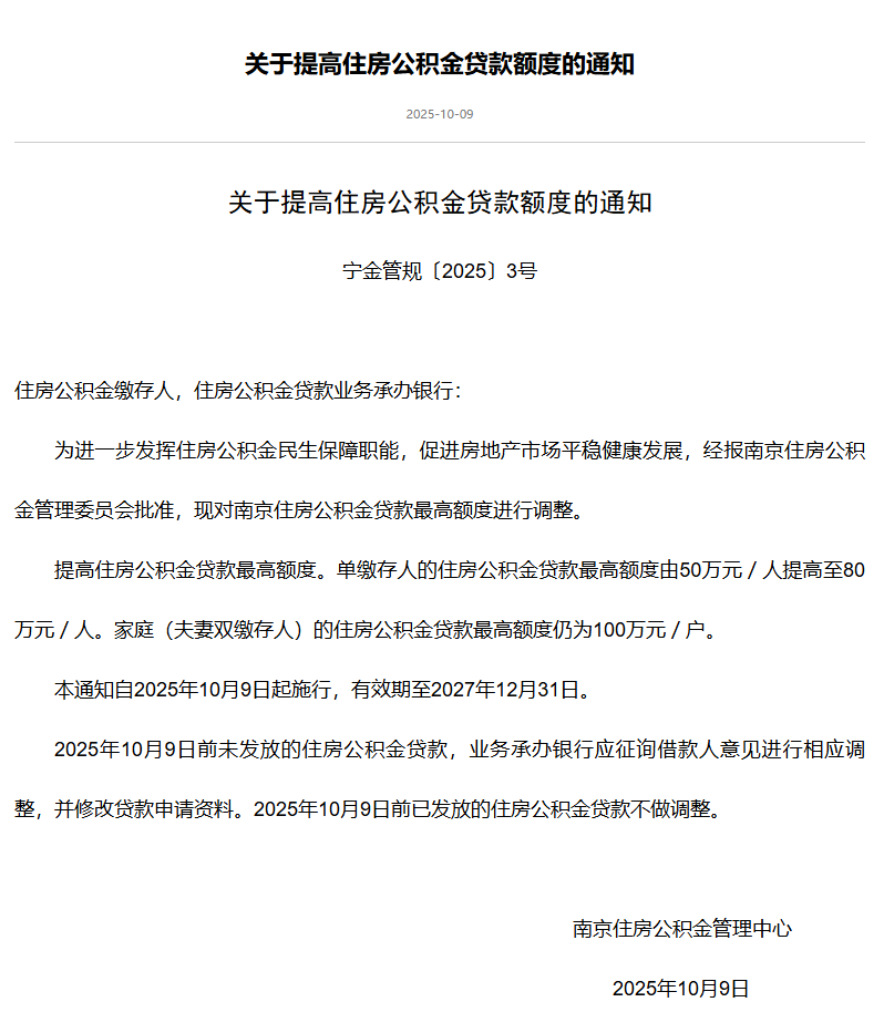 南京住房公积金管理中心发布《关于提高住房公积金贷款额度的通知》,为进一步发挥住房公积金民生保障职能,促进房地产市场平稳健康发展,经报南京住房公积金管理委员会批准,现对南京住房公积金贷款最高额度进行调整。提高住房公积金贷款最高额度。单缴存人的住房公积金贷款最高额度由50万元/人提高至80万元/人。家庭(夫妻双缴存人)的住房公积金贷款最高额度仍为100万元/户。本通知自2025年10月9日起施行,有效期至2027年12月31日。