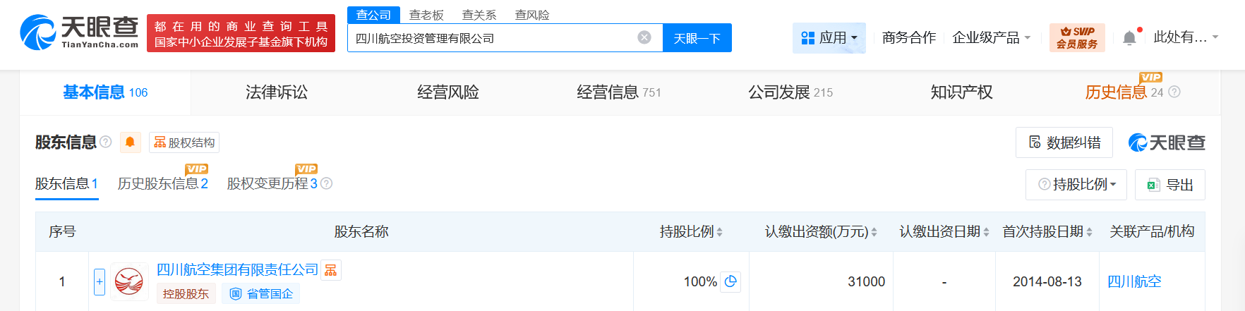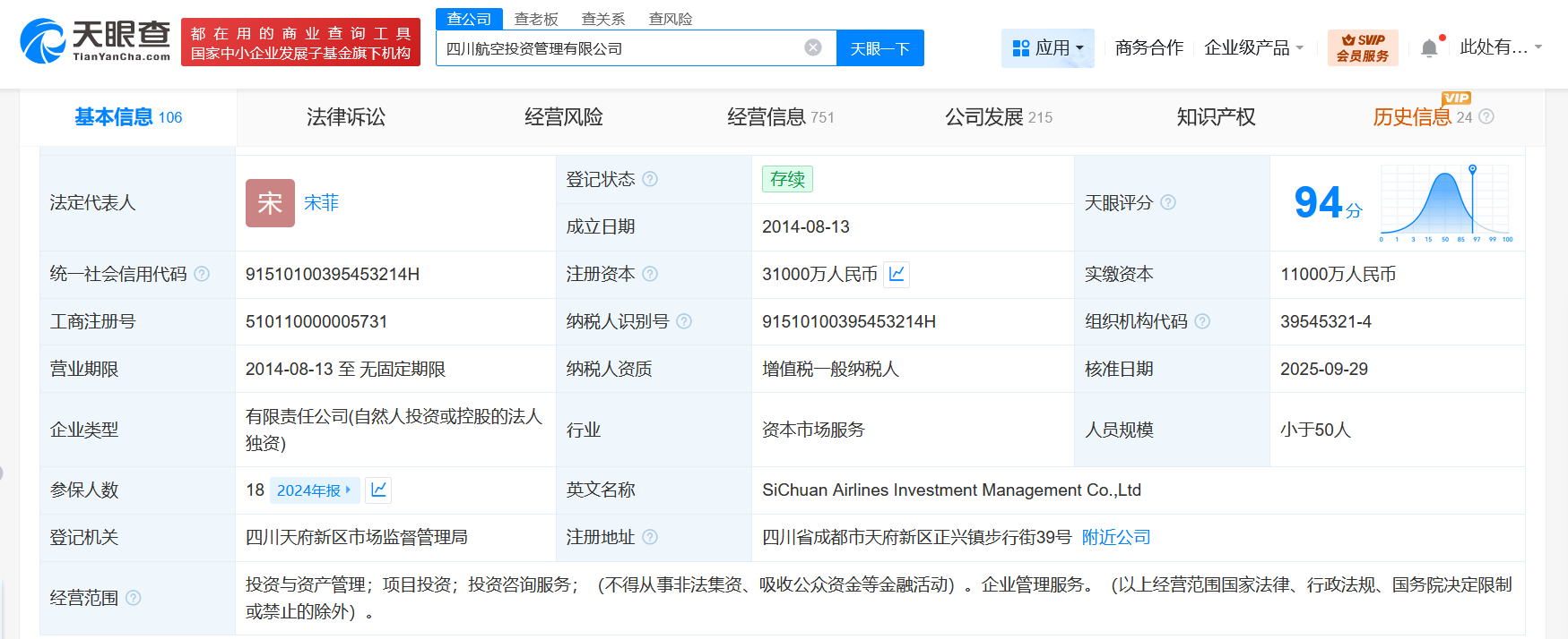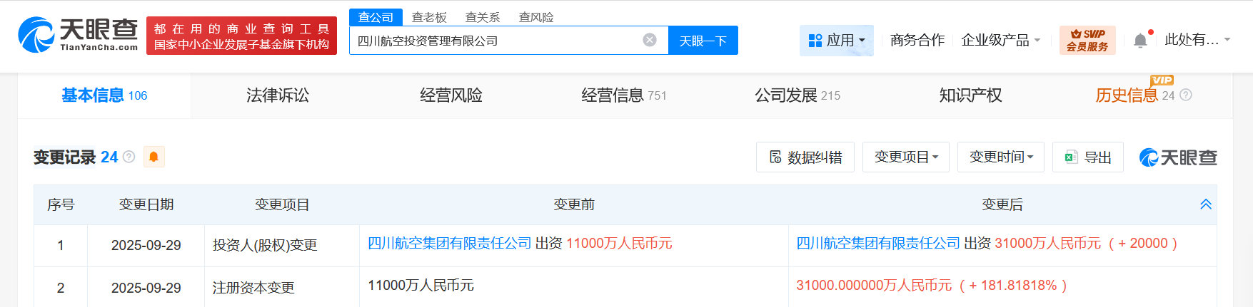 每经AI快讯,天眼查App显示,近日,四川航空投资管理有限公司发生工商变更,注册资本由1.1亿元人民币增至3.1亿元人民币,增幅约182%。该公司成立于2014年8月,法定代表人为宋菲,经营范围为投资与资产管理,项目投资,投资咨询服务,企业管理服务。股东信息显示,该公司由四川航空集团有限责任公司全资持股。