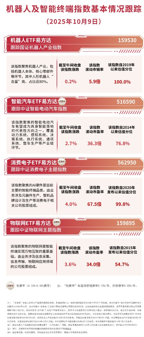 截至午间收盘,国证机器人产业指数上涨0.2%,中证智能电动汽车指数上涨2.7%,中证消费电子主题指数上涨4.0%,中证物联网主题指数上涨3.6%。Wind数据显示,截至9月30日,消费电子ETF易方达(562950)近10个交易日净流入超4亿元。