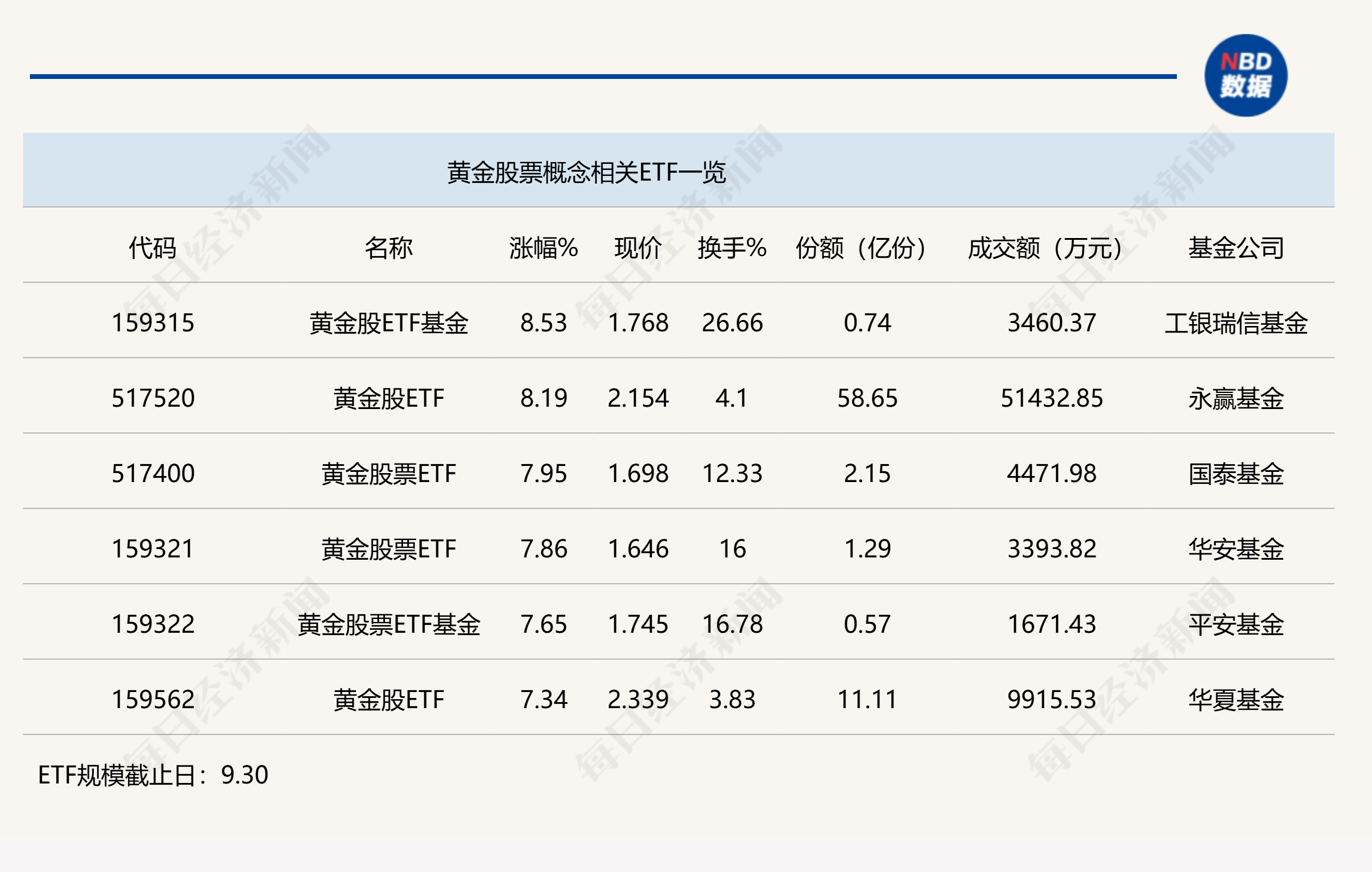 点评:黄金股ETF基金(159315)今日上午大涨8.53%,其份额规模为0.74亿份,半日成交金额为3460.37万元,该ETF追踪的是中证沪深港黄金产业股票指数,追踪该指数的ETF还包括黄金股ETF(517520)、黄金股票ETF基金(159322)等。其中,黄金股ETF(517520)规模最大,达到58.65亿份,其半日涨幅为8.19%,成交金额达到5.14亿元。