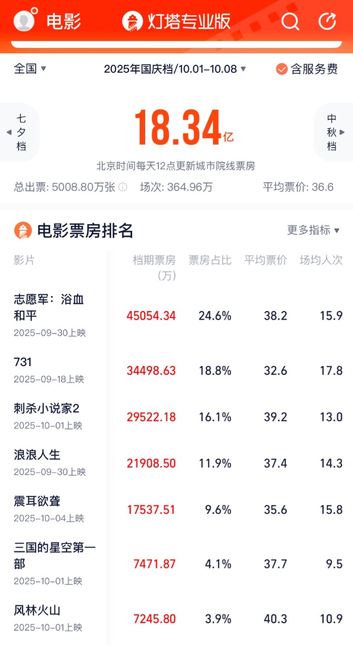 根据灯塔专业版数据,2025年国庆档(10月1日—10月8日)总票房突破18亿元,达18.34亿元。其中,《志愿军:浴血和平》《731》《刺杀小说家2》位列前三,档期票房分别约4.51亿元、3.45亿元和2.95亿元。