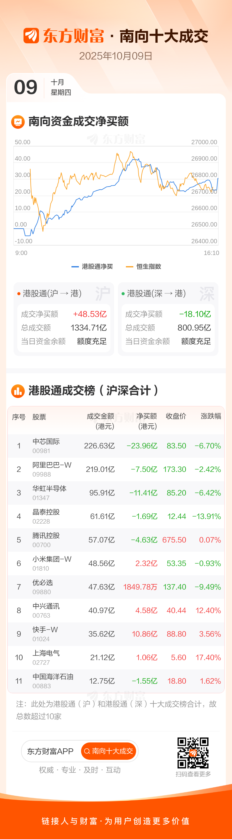 10月9日南向资金净买逾30亿港元,逾10亿抢筹快手-W
