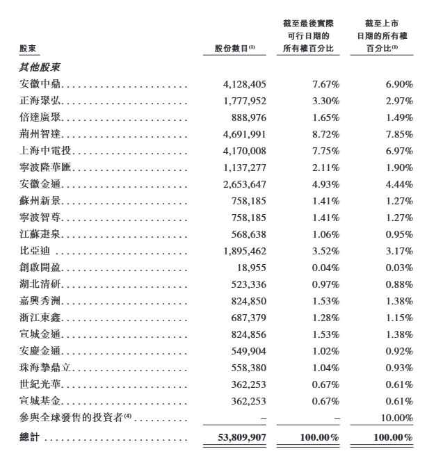此外,在挚达科技的股东层面,挚达科技与首次公开发售前投资者进行了多轮首次公开发售前投资,包括但不限于安徽中鼎、荆州智达、上海中电投、金通资本、比亚迪等。