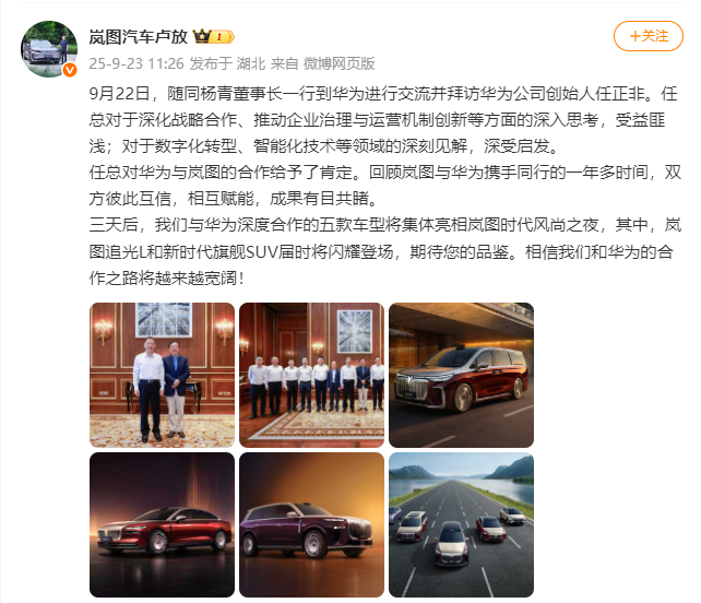 卢放随后发布微博称,任正非对华为与岚图汽车的合作给予肯定。回顾双方同行的一年多时间,相互赋能的成果有目共睹。相信岚图汽车与华为的合作之路将越来越宽阔。