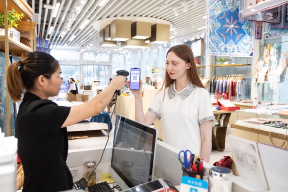 外国游客扫支付宝付款码,购买中国丝绸制品带回家图片来源:支付宝