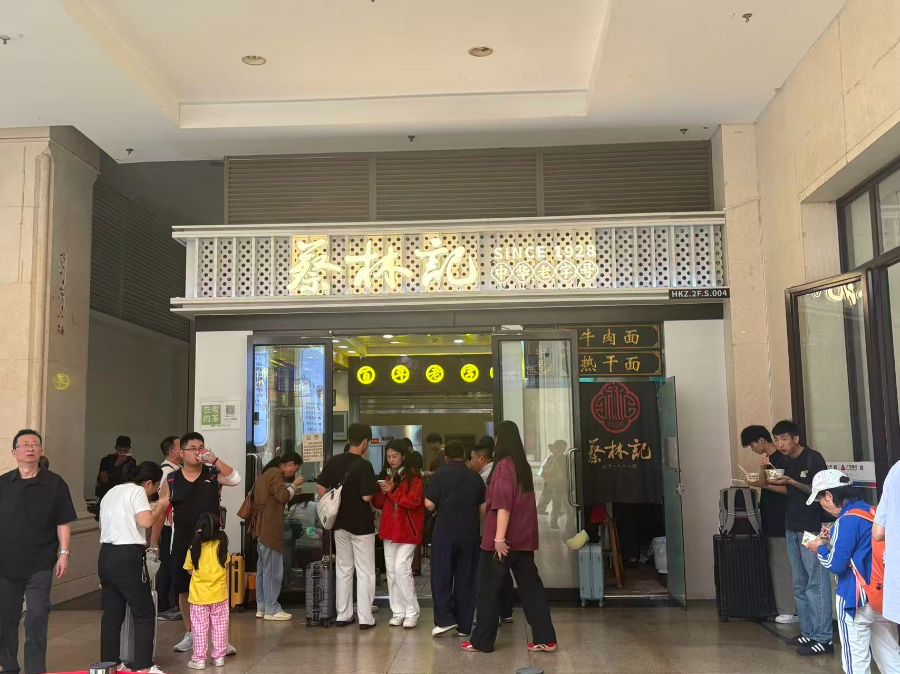 21世纪经济报道记者假期在武汉的汉口火车站看到,站内几家蔡林记热干面馆都生意火爆,面馆推出了一些非遗套餐,兼具了地方特色和性价比,颇受旅客欢迎,因为面馆座位满员,不少旅客扎堆站在面馆门口吃面。