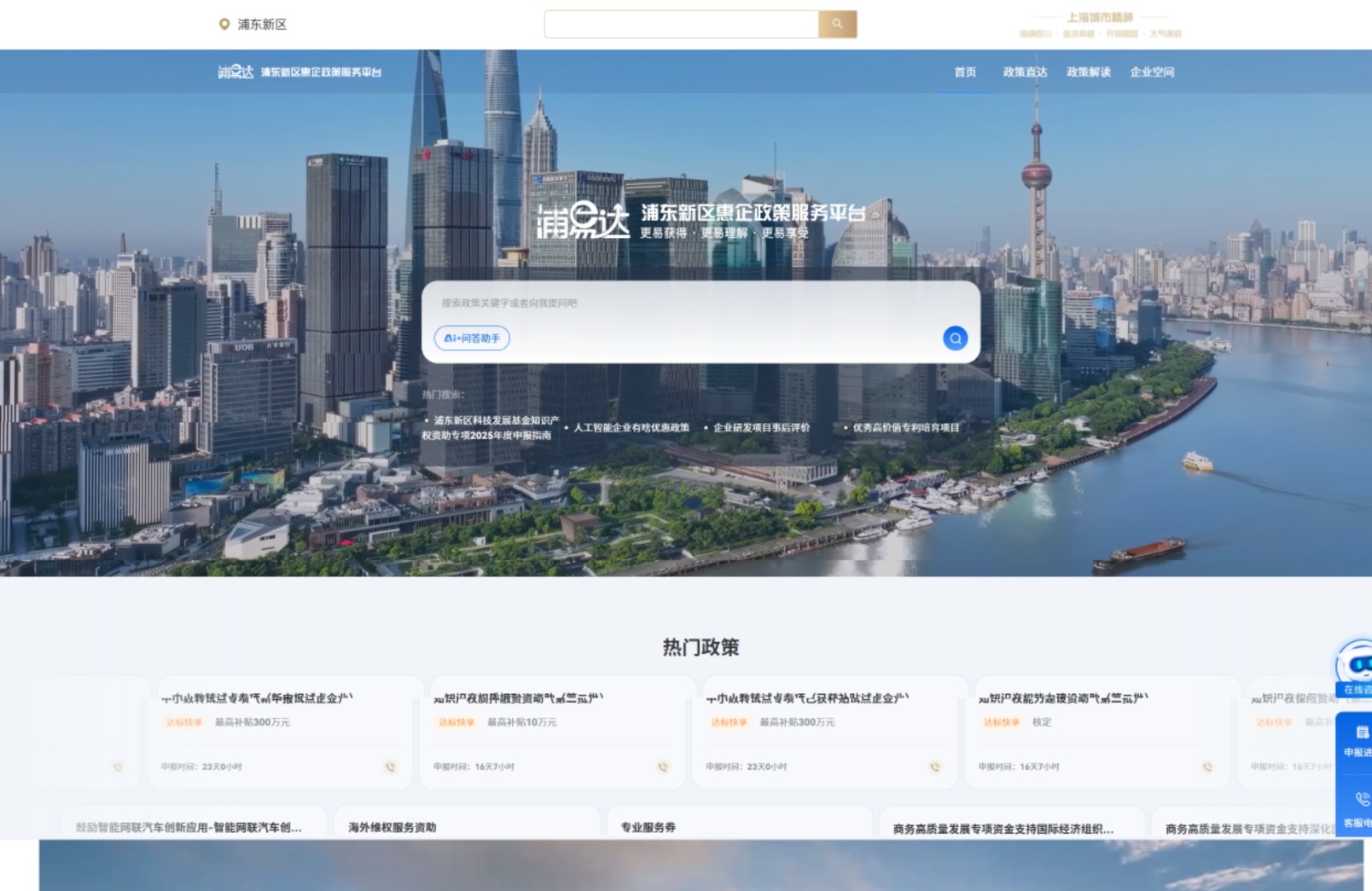 据悉,“浦易达”是政策全量归集、全程线上办理、市区兑付贯通、垂类模型应用的综合性平台,实现了政策查询、申报、审批、兑付的全流程线上闭环,企业无需重复注册登录,仅需通过“https://pyd.pudong.gov.cn”一个端口即可通办浦东全量惠企政策。截至目前,平台已汇集约20家政策制定部门的260余条惠企政策、服务企业超1万次,兑付金额近2亿元,形成了“企业找政策”到“政策找企业”的服务新模式。