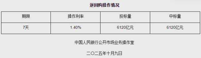 中新网10月9日电据央行网站消息,2025年10月9日中国人民银行以固定利率、数量招标方式开展了6120亿元7天期逆回购操作。具体情况如下: