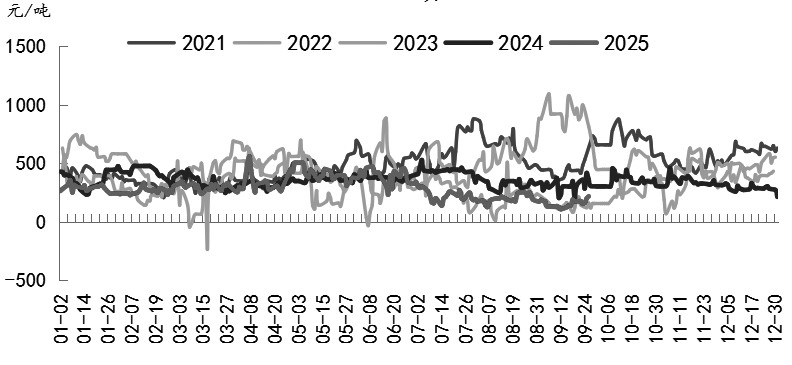 PTA低加工费触发行业“反内卷”,但中期而言,PTA供应过剩和低加工费格局仍将延续。9月下旬,下游持货意愿较低,而PTA供应商持续出货,从而造成了PTA基差疲软。前期PTA现货加工费一度跌至200元/吨以下,跌破了大部分PTA工厂的现金流水平。部分工厂计划10—11月检修,并且独山能源四期PTA新装置也推迟了投产时间,这带动了加工费阶段性修复。由于当前中国PTA产能在9170万吨,原料PX的供应相对偏紧,在新的PX装置投产之前,PTA加工费难以趋势性回升,预计仍维持低位。