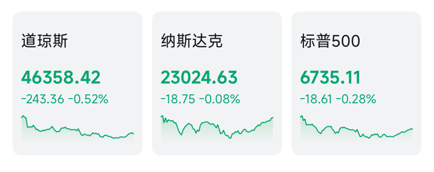 当地时间周四,美股三大股指小幅收跌。截至收盘,道指跌0.52%报46358.42点,标普500指数跌0.28%报6735.11点,纳指跌0.08%报23024.63点。